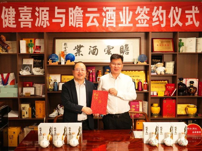 2026 年 2 月 27 日,贵州瞻云酒业有限公司(下称 “瞻云酒业”)与国内专业健康消费甄选平台健喜源正式签署战略合作协议,此次合作是瞻云酒业在与新会六真陈皮达成原料端深度战略合作、锁定道地陈皮核心供应链后的又一重要举措。签约当日,健喜源总裁、人大校友龚恒俭先生一行莅临瞻云酒业茅台镇酱香白酒核心产区酒厂,实地走访酿造车间、陈化仓库与研发中心,对悦参元陈皮酱香酒的原料甄选、工艺创新及全流程品控体系进行深度考察,对产品的定位给予了高度认可与赞赏。